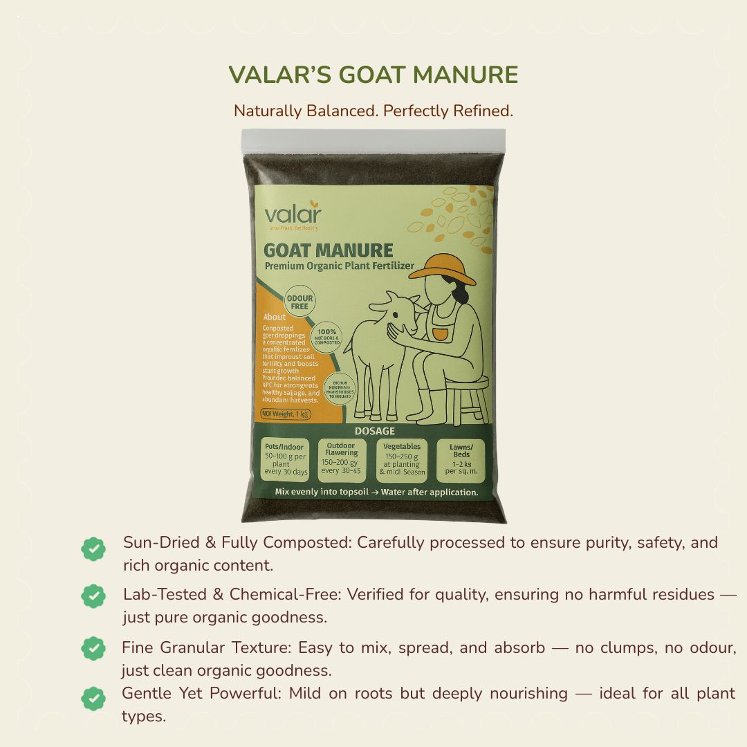 Goat manure is a natural organic fertilizer rich in essential nutrients that improve soil fertility and plant growth. It releases nutrients slowly, helping plants develop strong roots, healthy foliage, and better yields without burning them. Goat manure also improves soil structure, enhances water retention, and supports beneficial soil microbes, making it an excellent choice for vegetables, flowers, fruit plants, and organic gardening.